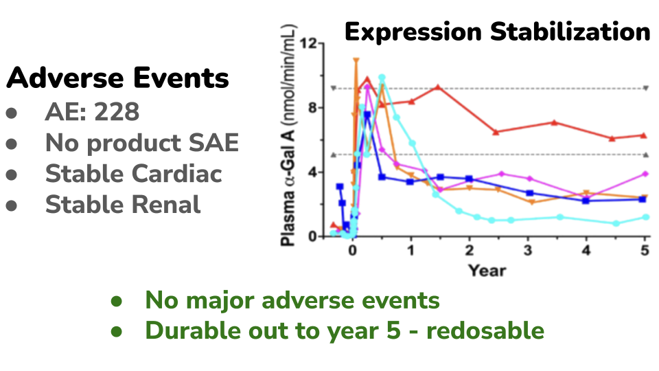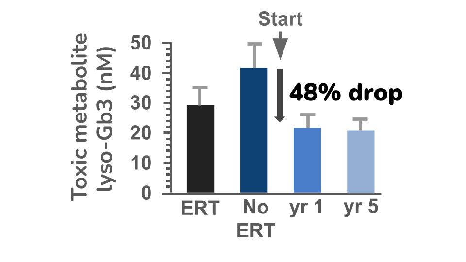 Our lead program is GT-GLA-S03 Live-cel therapy for Fabry disease and it was evaluated in clinical trials in Canada. To measure how well the treatment worked, the Canadian researchers measured the build up of the harmful lipid (fatty) substance in the blood called lyso-Gb3, which acts as a biomarker for disease severity. At the start of the study, all patients were receiving standard enzyme replacement therapy (ERT) and their lyso-Gb3 levels were at a steady and safe plateau level . When ERT was stopped, levels of lyso-Gb3 increased (No-ERT), confirming that the disease activity was rising again. After patients received the cell therapy, lyso-Gb3 levels decreased by 48%, showing a substantial reduction in harmful buildup. Importantly, a reassessment of patients, five years after their initial dose of cell therapy, the lyso-Gb3 levels remained well controlled - no build up occurred. This indicates Live-cel therapy can provide at least a 130x increase in durability treatment from a single dose, when compared to standard of care with ERT. As a result, patients receiving Live-cel will obtain a dramatic improvement in quality of their lifestyle.